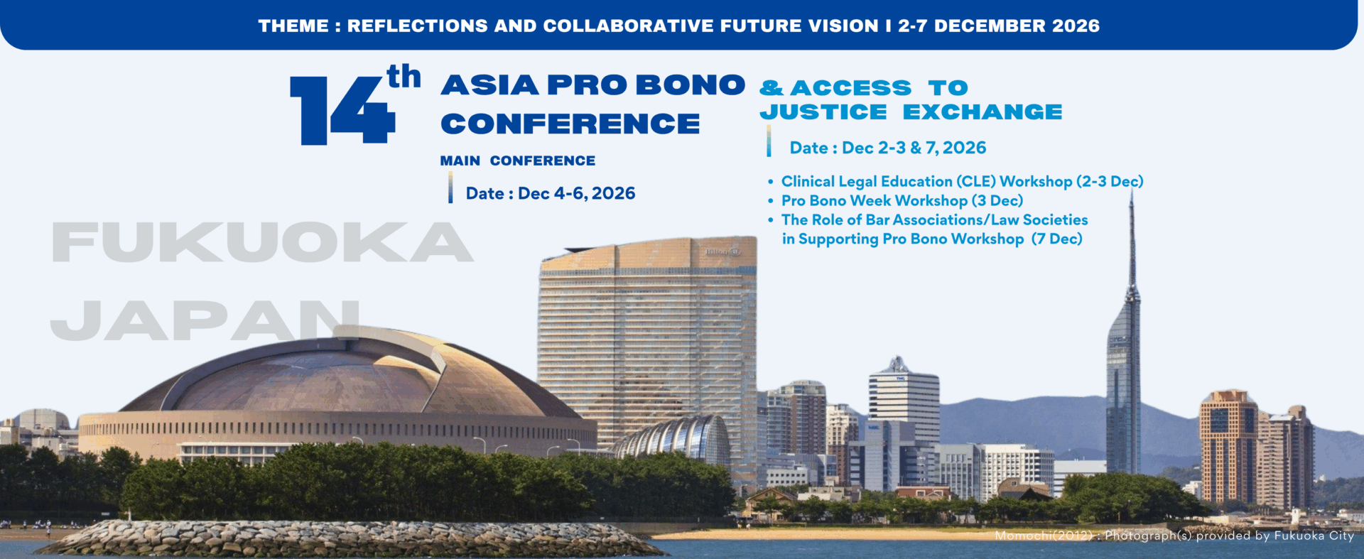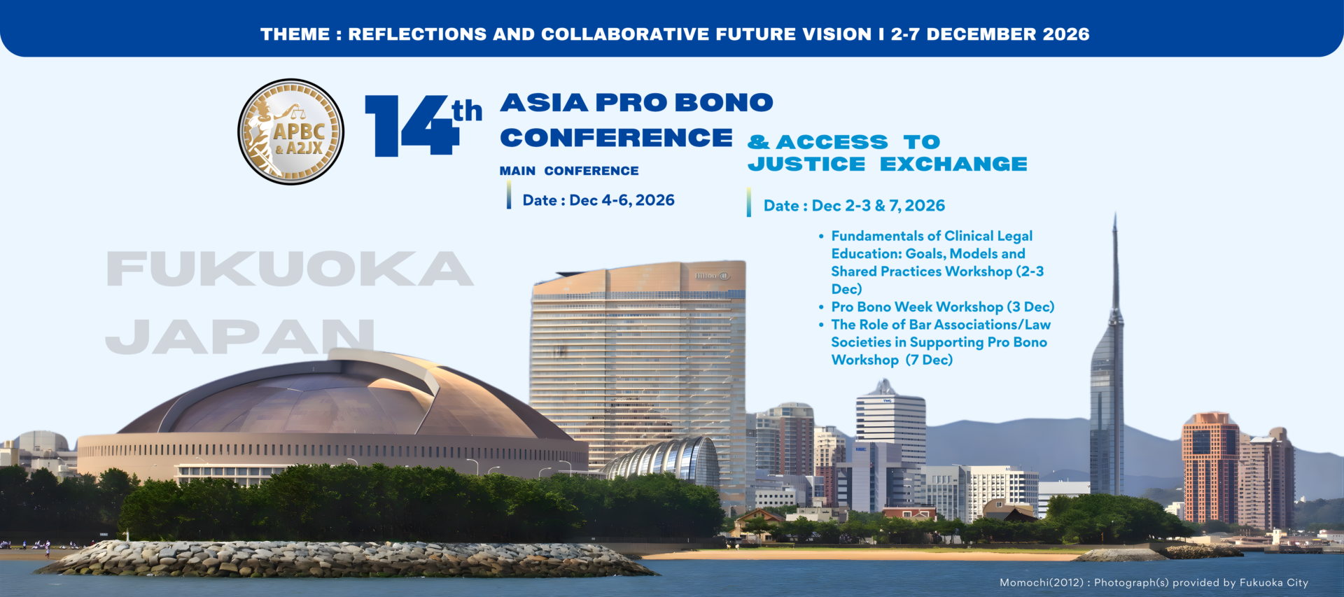 Join us in Fukuoka for the 14th Asia Pro Bono Conference & Access to Justice Exchange (14APBC&A2JX), a dynamic 6-day convening bringing together legal service providers, legal practitioners, academics, justice educators, students, community advocates, and pro bono champions from across the region and beyond.